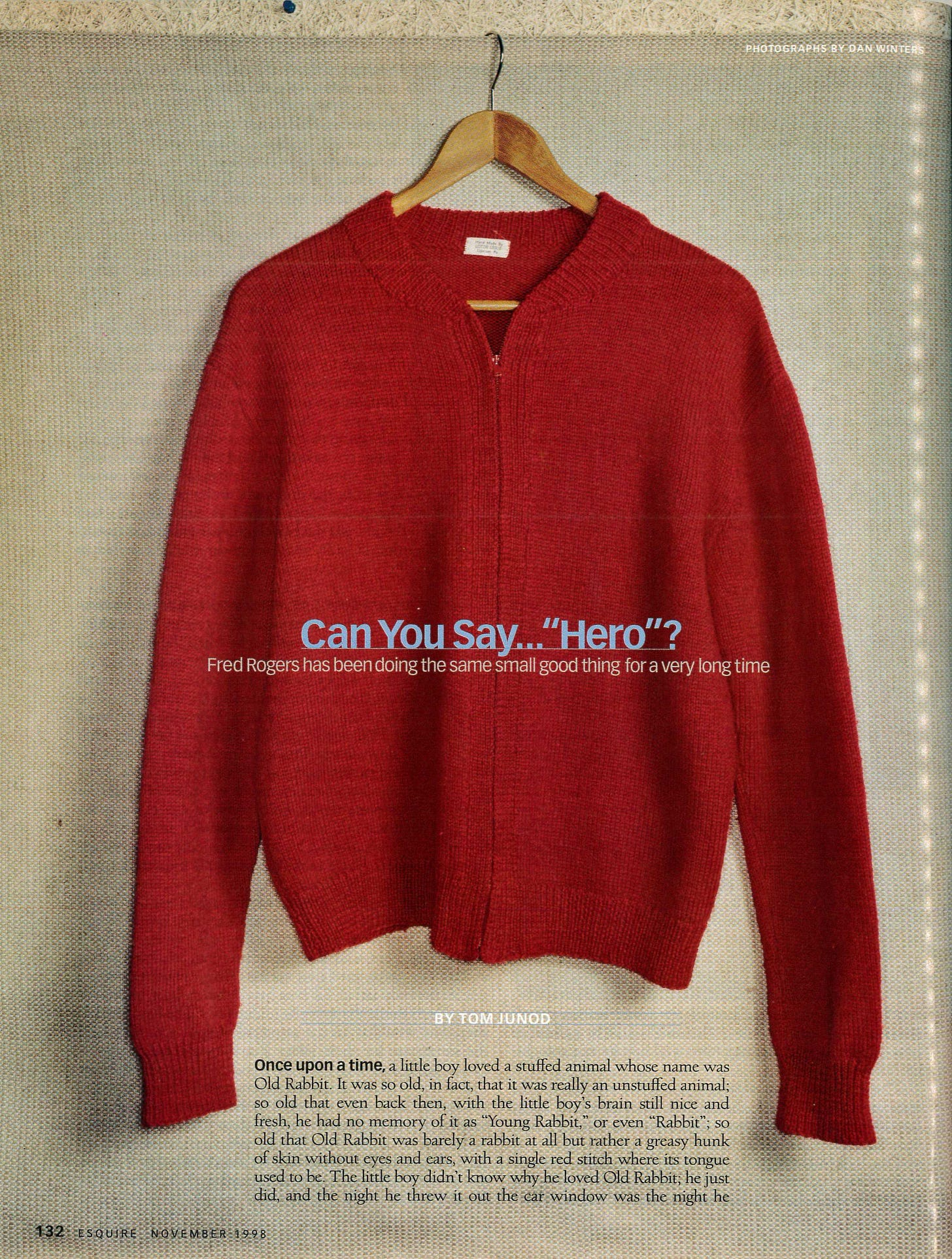 “Yes, at seventy years old and 143 pounds, Mister Rogers still fights, and indeed, early this year, when television handed him its highest honor, he responded by telling television—gently, of course—to just shut up for once, and television listened. He had already won his third Daytime Emmy, and now he went onstage to accept Emmy's Lifetime Achievement Award, and there, in front of all the soap-opera stars and talkshow sinceratrons, in front of all the jutting man-tanned jaws and jutting saltwater bosoms, he made his small bow and said into the microphone, ‘All of us have special ones who have loved us into being. Would you just take, along with me, ten seconds to think of the people who have helped you become who you are….Ten seconds of silence.’ And then he lifted his wrist, and looked at the audience, and looked at his watch, and said softly, ‘I'll watch the time,’ and there was, at first, a small whoop from the crowd, a giddy, strangled hiccup of laughter, as people realized that he wasn't kidding, that Mister Rogers was not some convenient eunuch but rather a man, an authority figure who actually expected them to do what he asked…and so they did. One second, two seconds, three seconds…and now the jaws clenched, and the bosoms heaved, and the mascara ran, and the tears fell upon the beglittered gathering like rain leaking down a crystal chandelier, and Mister Rogers finally looked up from his watch and said, ‘May God be with you’ to all his vanquished children.”