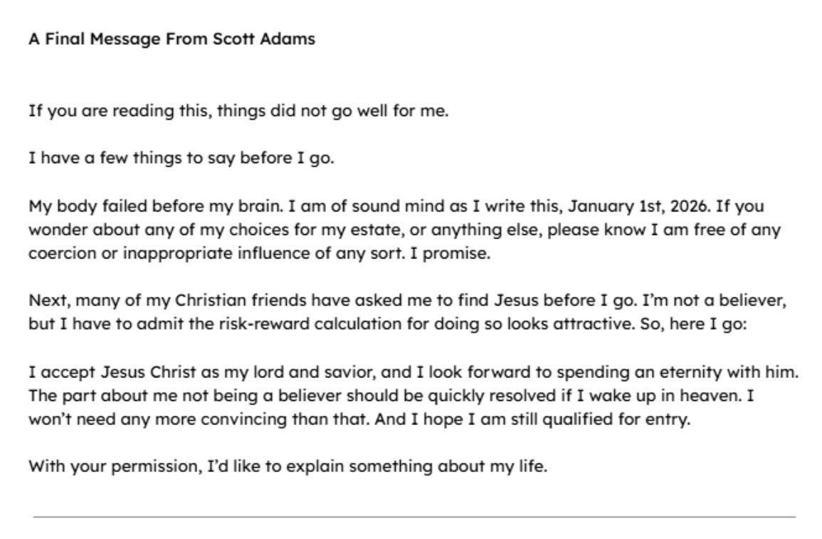 Earlier today, I came across a few social media posts rejoicing over the apparent deathbed conversion of Dilbert creator Scott Adams. Beyond his comic-strip fame, I can’t pretend to know much of anything about Adams, though I’m vaguely aware that he’s been a voice in conservative politics over the last few years to some online degree. My goal here is not to decry a dead man’s faith (or lack thereof), nor to explain why this conversion doesn’t “count” or anything like that.1 This article isn’t really about Adams at all, but it seemed like a perfect opportunity to remark on the transactional way we conceptualize things like faith and salvation, because I think Adams was well within the norm in the way he expressed his apparent conversion.